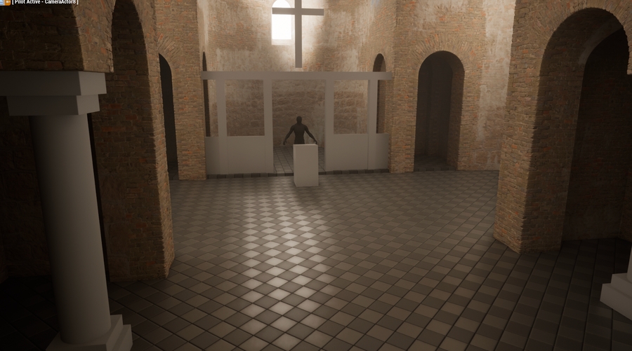 Various curved variations for the scene The brick pieces in an early version of the scene Alongside texturing, I would bounce between editing the structure, lighting and layout of the church. Here in the third image above, it’s all starting to come together. The promo shot angle is also in it's infancy.