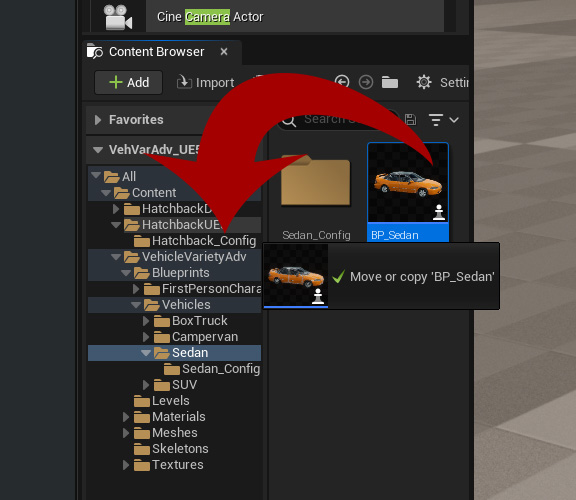 In order to start editing your new vehicle - head on over to the sedan section in the "VehicleVarietyAdv -> Blueprints -> Sedan" Folder and drag and copy the Sedan into our Hatchback folder.